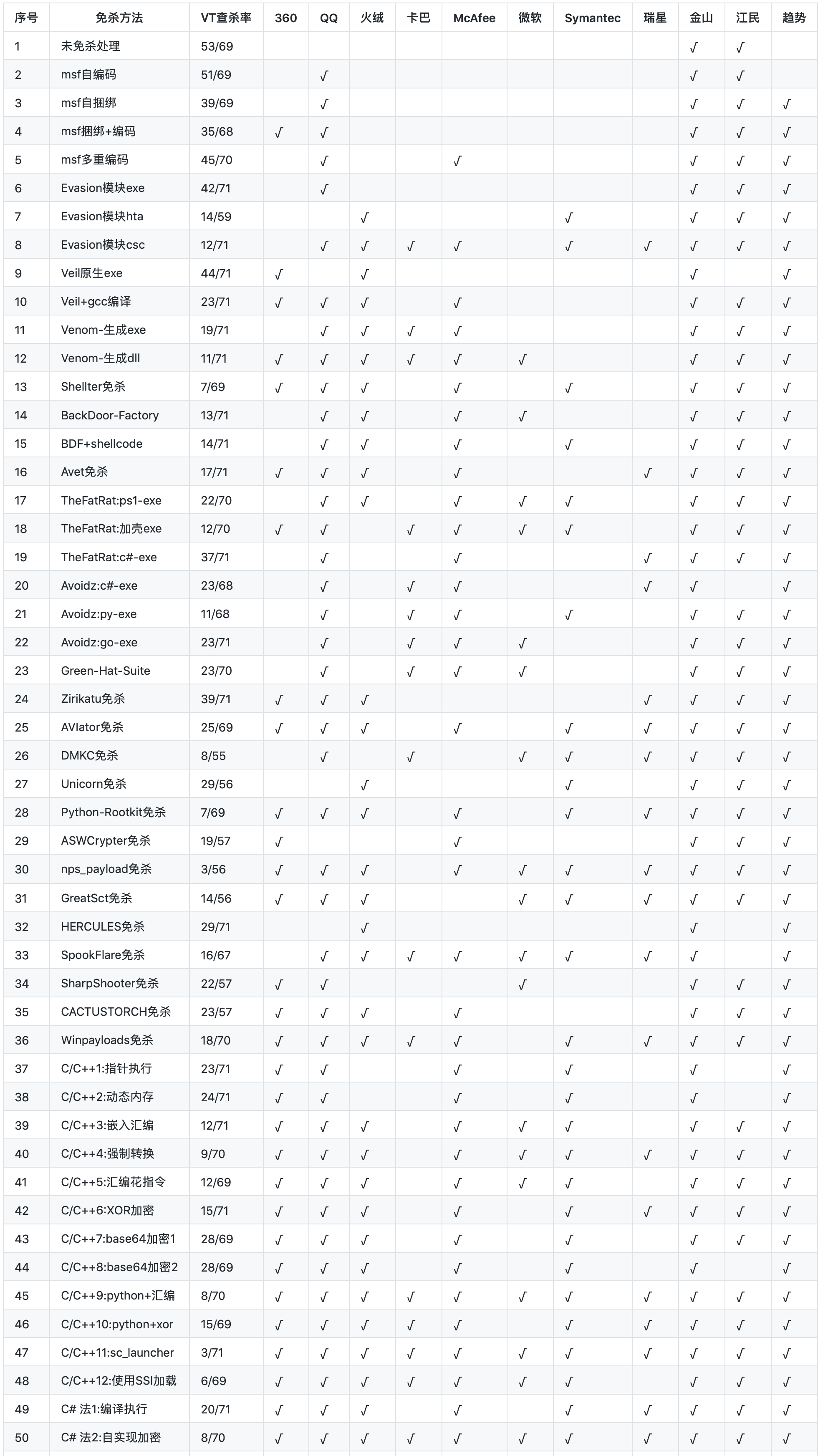 • 免杀 指的是该恶意软件经过特殊处理,能够绕过目标计算机上的安全防护措施(例如防病毒软件、网络安全软件等)的检测。免杀技术通常通过修改恶意软件的代码、加密或使用反沙箱技术等手段来使其逃避安全软件的监控。