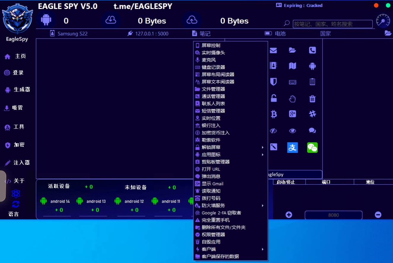 EagleSpy-V5-Cracked 安卓远控木马下载 2025最新中文版含一键免杀工具 黑客攻击安卓免杀必备后端工具。它结合了安卓远控木马(Remote Access Trojan, RAT)和免杀工具的功能,具有高度的隐蔽性和破坏性。